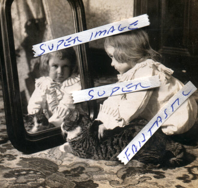 (8 X 10 ) A FANTASTIC PHOTO OF A SWEET GIRL AND CAT LOOKING INTO A MIRROR