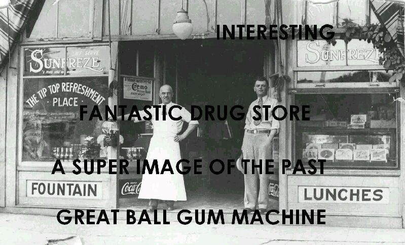 (8 X 10 ) A FANTASTIC PHOTO OF A DRUG STORE EXTERIOR WITH SUPER BALL GUM MACHINE AND CIGAR DISPLAY