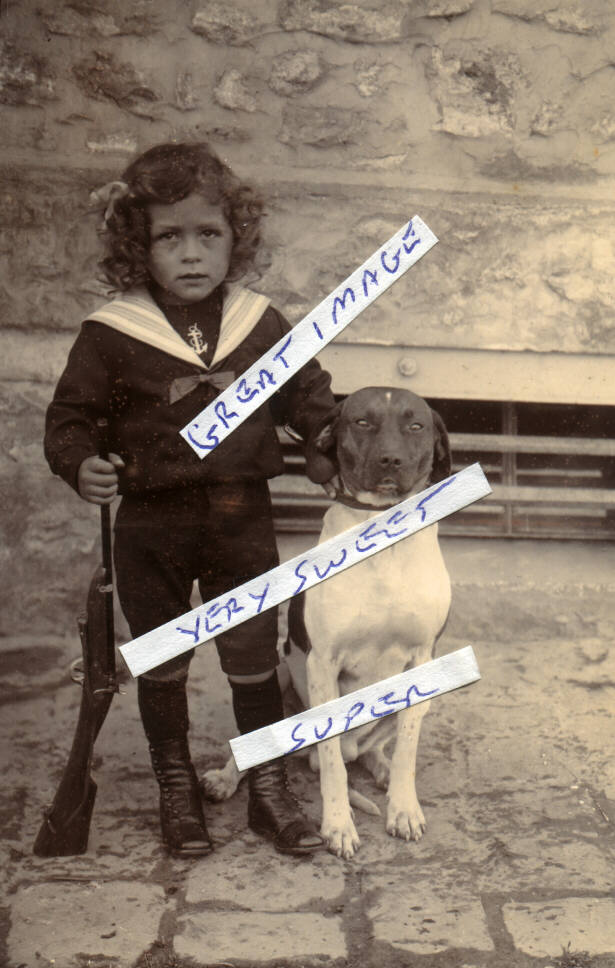 (8 X 10 ) A MOST WONDERFUL PHOTO OF A LITTLE GIRL WITH RIFLE, DOG AND SAILOR SUIT