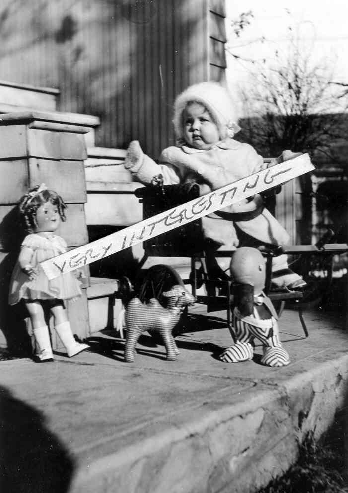 (8 X 10 ) A WONDERFUL PHOTO OF A CHILD WITH NEAT TOYS INCLUDING A SHIRLEY TEMPLE DOLL