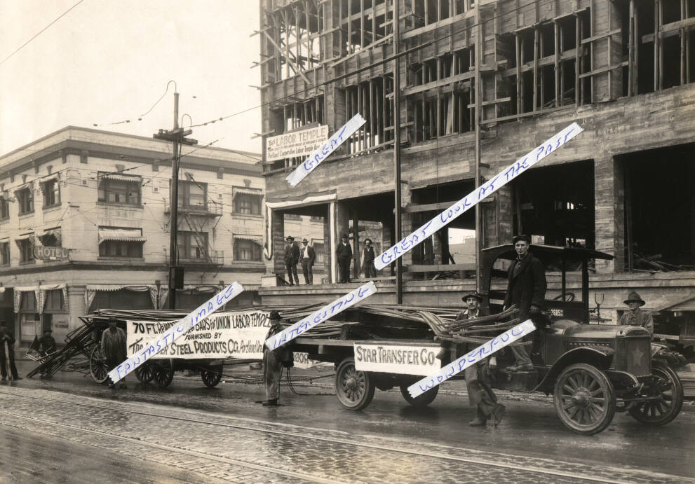 (8 X 10 ) AN INTERESTING PHOTO OF A DELIVERY TRUCK AT THE UNION LABOR TEMPLE..WE'RE NOT SURE WHERE THIS IS LOCATED