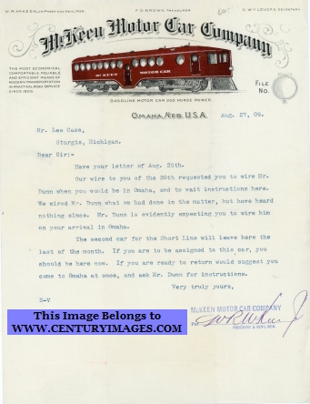 A Vintage Old Letterhead of the McKeen Motor Car Company of Omaha Nebraska The McKeen Motor Car Company of Omaha, Nebraska was a builder of internal combustion-engined railroad motor cars (railcars), constructing 152 between 1905–1917.[1] Founded by William McKeen, the Union Pacific Railroad's Superintendent of Motive Power and Machinery, the company was essentially an offshoot of the Union Pacific and the first cars were constructed by the UP before McKeen leased shop space in the UP's Omaha Shops in Omaha, Nebraska. The UP had asked him to develop a way of running small passenger trains more economically, and McKeen produced a design that was ahead of its time. Unfortunately, internal combustion engine technology was not, and the McKeen cars never found a truly reliable powerplant. The vast majority of the cars produced were for E. H. Harriman's empire of lines (Union Pacific, Southern Pacific and others). Harriman's death in 1909 lost the company its major sponsor and investor, and Harriman's successors were less enthusiastic about the McKeen cars. Many McKeen cars ended up being re-engined with a variety of drive mechanisms — gasoline-mechanical, gasoline-electric, diesel-electric, or even steam power. Most, although not all, McKeen cars had the distinctive "wind-splitter" pointed aerodynamic front end and rounded tail. The porthole windows were also a McKeen trademark, adopted allegedly for strength after the 7th production car. A dropped central door was also present on the majority of the cars. Two lengths, 55 and 70 feet, were offered; either could be fitted out with a large mail and express area ahead of the center doors, a smaller mail/express area, or the car could be all seats for a maximum capacity of 64 or 105 respectively. Click Here for More Information about McKeen Motor Car Company